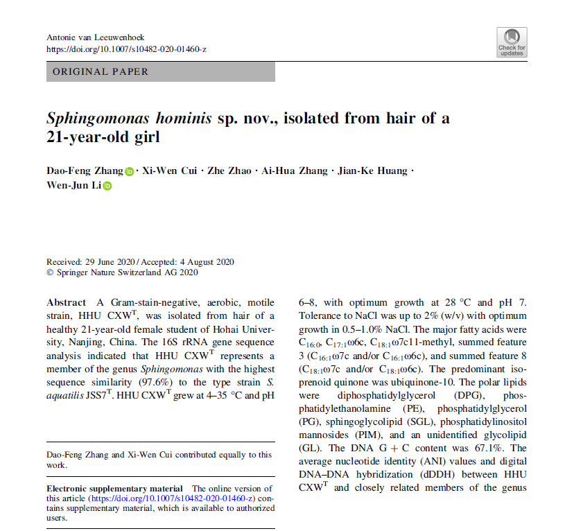 近日,直播平台 海洋生物系张道锋博士和2016级本科生崔希雯同学为共同第一作者在SCI收录源刊、以显微镜发明者列文虎克命名的国际微生物学期刊《Antonie van Leeuwenhoek》在线发表了题为“Sphingomonas hominis sp. nov., isolated from hair of a 21-year-old girl”的文章(//link.springer.com/article/10.1007/s10482-020-01460-z)。