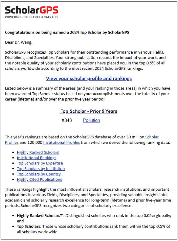 近日,国际学术评价机构ScholarGPS(Scholar Global Positioning System)正式发布2024年度全球顶尖学者榜单。直播平台 王腾副教授凭借其在污染领域的卓越学术贡献,成功入选ScholarGPS2024年度全球前0.5%顶尖学者榜单(污染领域)。